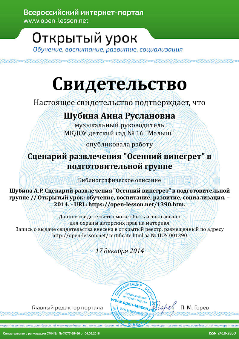 2. Е.В. Богинская Осенний винегрет. Сценарий игровой программы для старших дошкольников. //Музыкальная палитра № 5, 2014 г.