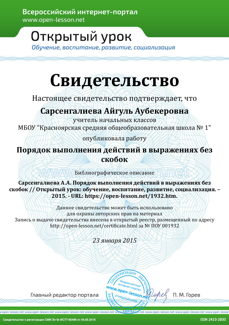 (Тема «Порядок выполнения действий в выражениях без скобок»)