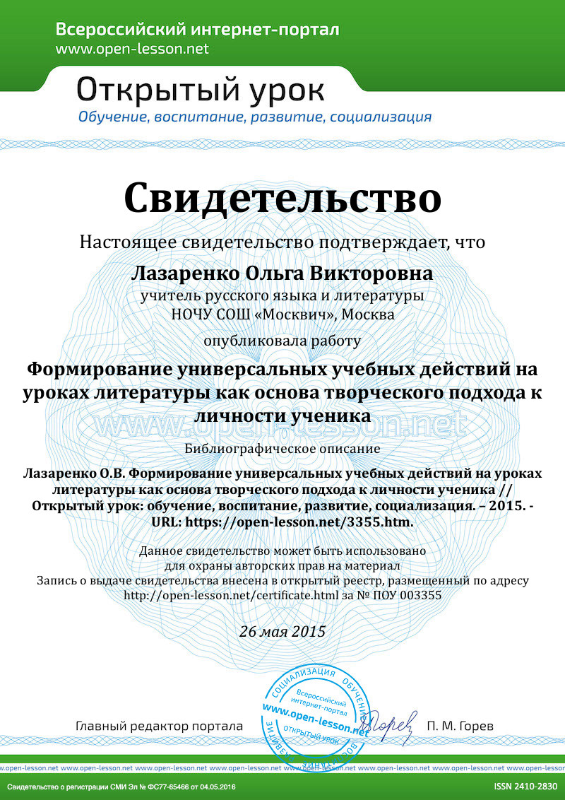 Особая роль в непростом процессе социальной адаптации, безусловно, принадлежит гуманитарным дисциплинам, в частности литературе. Предлагаемая статья – попытка показать, как интересно и разнопланово могут применяться принципы формирования личностных универсальных учебных действий, регулятивных универсальных учебных действий, познавательных универсальных учебных действий, коммуникативных универсальных учебных действий на уроках литературы, что в конечном итоге должно помочь учащимся найти пути как к полноценной личностной самореализации, так и к гармоническому сопряжению себя с социумом. Именно на подобное многогранное формирование личности школьника нацелен Федеральный государственный образовательный стандарт основного общего образования (1).