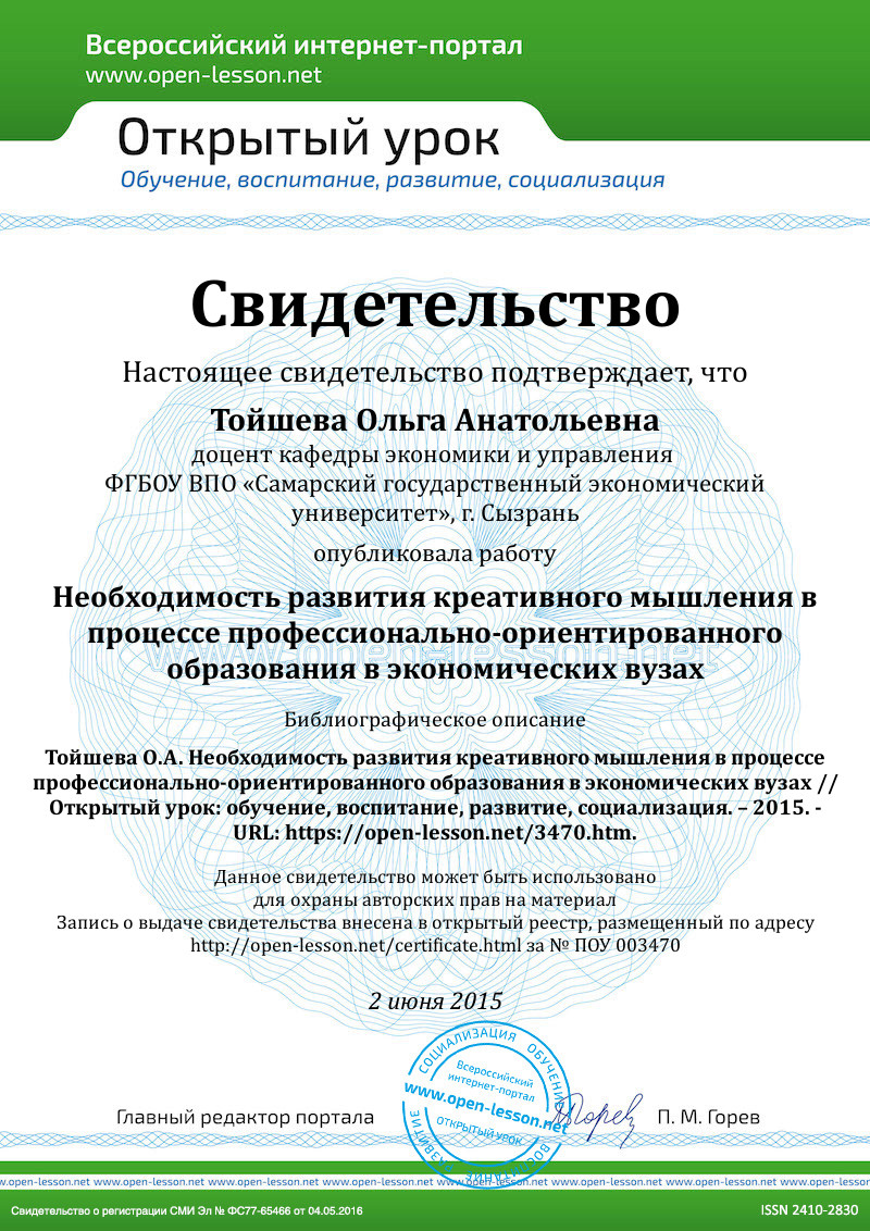 - Тойшева О. А. Необходимость повышения уровня информационного образования студентов экономических вузов // Роль образования в формировании экономической, социальной и правовой культуры: сб. науч. тр. / Комитет по науке и высшей школе Правительства Санкт-Петербурга. 2014. – С. 588–590.