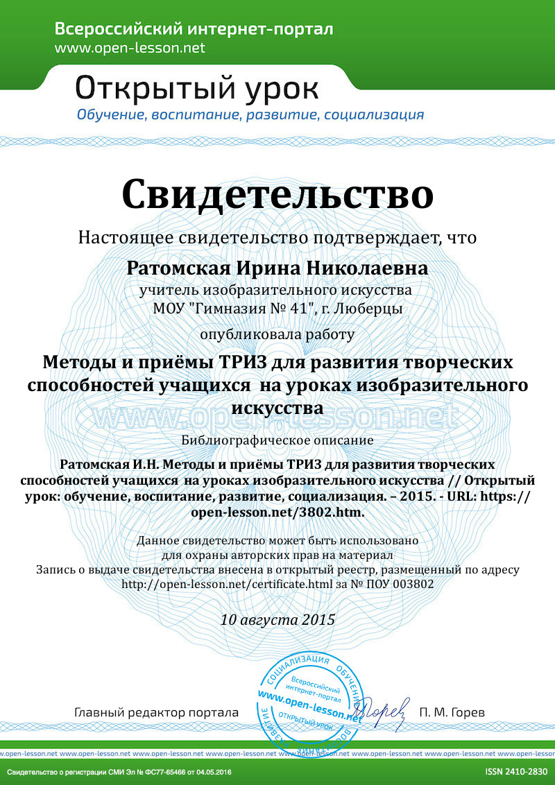 Целью системы образования является не только усвоение системы знаний, умений и навыков, составляющих инструментальную основу компетенций учащегося, но и всестороннее развитие личности, обретение духовно-нравственного опыта и социальной компетентности. В связи с переходом отечественной системы образования на ФГОС второго поколения усилилась потребность в совершенствовании методов и приёмов работы, которые позволят развить в учащихся индивидуальность, самостоятельность мышления, способность к решению сложных жизненных задач нестандартными методами [1]. Помощником в решении этих задач может служить инновационная педагогическая система НФТМ-ТРИЗ профессора М. М. Зиновкиной. ТРИЗ – это научно-практическое направление по разработке и применению эффективных методов решения творческих задач. Цель данной системы НФТМ-ТРИЗ: обеспечение становления, т. е. формирования и развития, творческой личности обучаемого. А творческая личность – это личность, обладающая системным мышлением, способная решать творческие задачи любого уровня творчества. Система НФТМ-ТРИЗ основана на поисково-познавательной деятельности учащихся, начиная с самого раннего детского возраста [2, 3]. Побуждение ребёнка к творчеству открывает для него путь к раскрытию своей индивидуальности, к реализации своих способностей. [2]. Широкое распространение получают нетрадиционные виды уроков, способствующие развитию творческой активности школьников. Уроки изобразительного искусства имеют большое значение в системе обучения и воспитания учащихся образовательной школы. Ведь они таят в себе огромный творческий потенциал, дают много возможностей для самовыражения, саморазвития, а в комплексе с другими учебными предметами оказывают заметное развивающее воздействие на ребёнка.