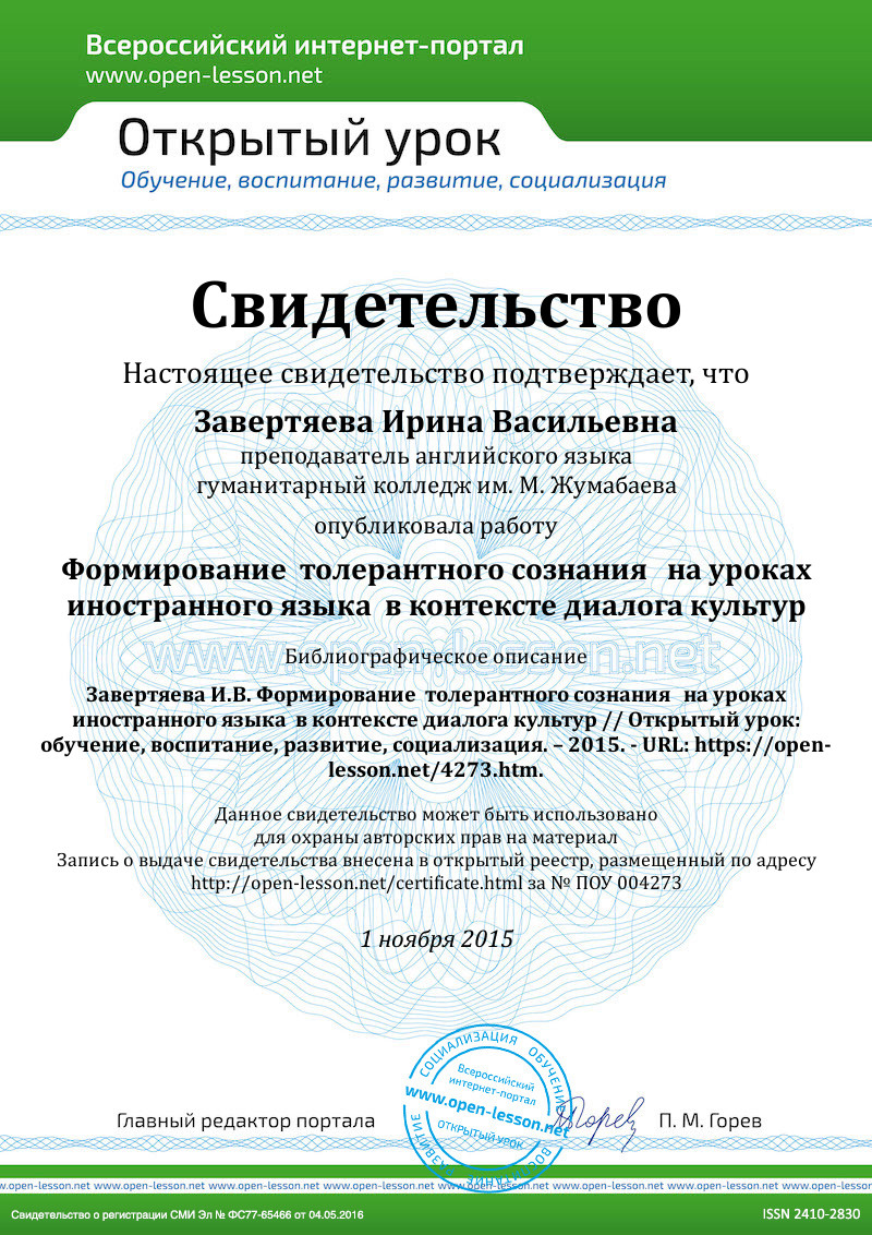 Необходимо рационально включать в материал уроканационально-региональный компонент. Таким образом, мы сможем развить у учащихся умение представлять не только свою страну, но и свою малую родину в условиях межкультурного общения. Все это, естественно, должно быть частью соответствующего раздела учебного плана. Национально-региональный компонент в процессе обучения английскому языку и культуре выступает в роли связующего элемента, способствующего проникновению в изучаемую культуру. Диалог культур является прекрасным средством борьбыпротив национальной неприязни, если он не ограничивается простым сопоставлением фактов родной и иностранной культуры. Очень важно научить учащихся умению самостоятельновыяснять, узнавать интерпретировать культурные ценности, соотносить существующие стереотипы с собственным опытом и делать адекватные выводы, а не пассивно получать информацию от учителя. Принцип обучения в контексте диалога культур создаётусловия изучения культуры стран изучаемого языка с опорой на мировую культуру и переосмысление отечественной культуры в зеркале мировой культуры, результатом которого является взаимопонимание. Неумолимо значение страноведения, которое направленона формирование языковой и коммуникативной компетентности, а значит, - и толерантности по отношению к иному национальному миру. Такие темы, как «Культура народов Казахстана и англоговорящих стран», «Национальная кухня народов Казахстана и стран изучаемого языка», «Этикет и обычаи разных народов», способствуют сравнительно-сопоставительному анализу учащимися различных аспектов собственной культуры и культуры стран изучаемого языка. Работа над текстом, обладающим воспитательным потенциалом, в полной мере не даст должного эффекта. Нужна и соответствующая его интерпретация, и соответствующее отношение к нему учителя. Если учитель, а за ним, следуя его примеру, и ученик высказывает свое мнение, свое отношение к предмету общения, то именно эта личная заинтересованность и является тем каналом, через который в душу и сознание обучаемого проникает воспитательное воздействие. Значение религии в воспитании нравственности идуховности сегодня никто оспаривать не станет. С целью воспитания уважения к взглядам и убеждениям людей различных вероисповеданий можно предложить учащимися освоение специальной лексики на тему различных религий и развития навыков англоязычного общения в рамках темы «Религия, обычаи, традиции, праздники». Всё это способствует укреплению морально –психологической обстановки, приобщению детей к национальной и мировой культуре,