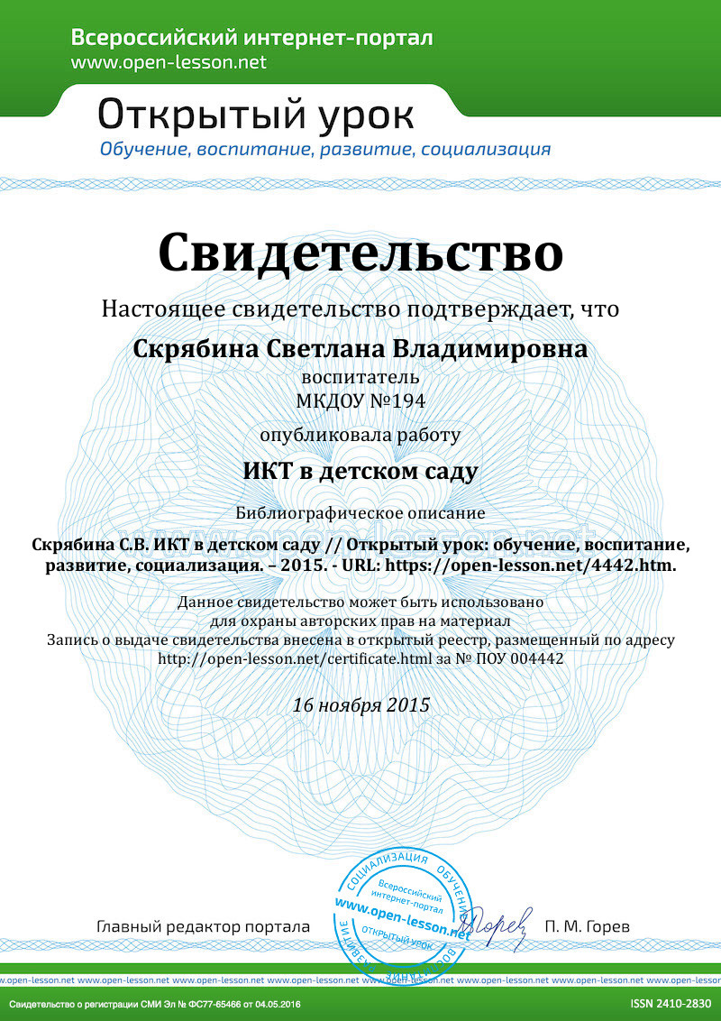 Своим опытом по использованию цифровых образовательных ресурсов, обменивалась в рамках творческой лаборатории, принимала участие в Неделе информатизации на Вятской земле, проводила Мастер – класс для слушателей курсов повышения квалификации педагогов при институте развития образования Кировской области (ИРО)