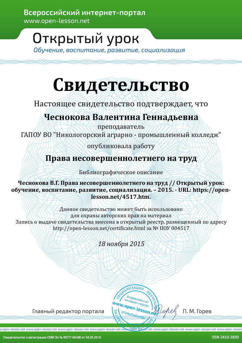 Учитель: По общему правилу, заключение трудового договора допускается с лицами, достигшими возраста 16 лет. Но в случае получения основного общего образования или окончания образовательного учреждения трудовой договор могут заключать лица, достигшие возраста 15 лет. А с согласия одного из родителей и органа опеки и попечительства трудовой договор может быть заключён с учащимися, достигшими возраста 14 лет, для выполнения в свободное от учёбы время лёгкого труда, не причиняющего вреда здоровью и не нарушающего процесса обучения.