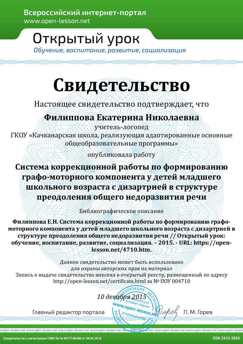 Таким образом, коррекционно-развивающая система формирования графо-моторного компонента в структуре преодоления общего недоразвития речи у детей с дизартрией младшего школьного возраста строится на системном воздействии на общую, мелкую, артикуляционную моторику, речь и другие психические процессы с широким применением методов нетрадиционной медицины, в тесной связи с естественной познавательной деятельностью ребёнка, особенностями нарушений письма, использованием авторских методов и приёмов с целью коррекции речевых нарушений и направлена на успешное обучение детей в школе и их дальнейшую социальную адаптацию.