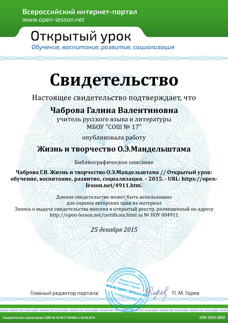Оборудование: презентация о жизни и творчестве О.Мандельштама, портреты О.Э.Мандельштама, аудиозапись с песней Аллы Пугачёвой «Ленинград» на стихи О.Мандельштама, аудиозапись стихотворения « Холод щекочет темя…» в исполнении О.Мандельштама.