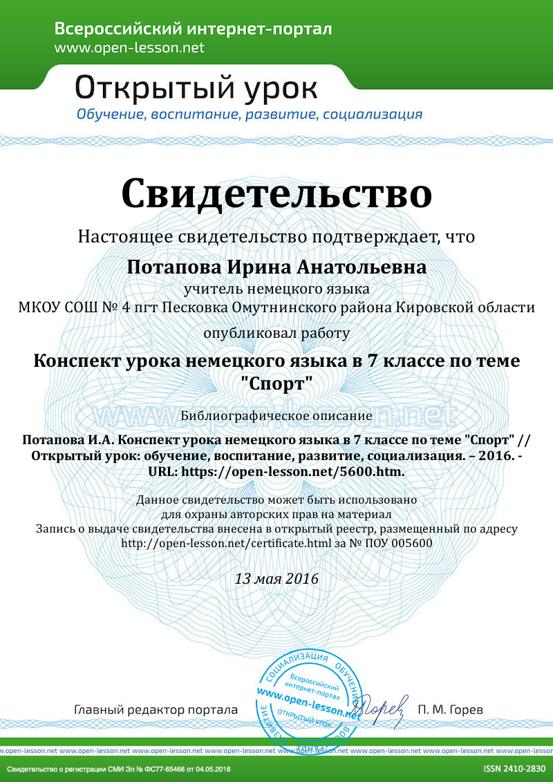 Учитель: Потапова И. А., учитель немецкого языка МКОУ СОШ №4 пгт Песковка Омутнинского района