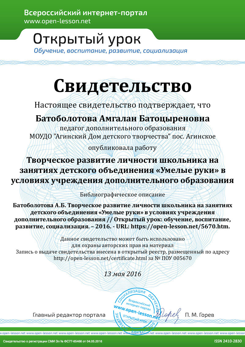 Цель: выявить условия творческого развития личности школьника на занятиях детского объединения «Умелые руки» в условиях учреждения дополнительного образования.