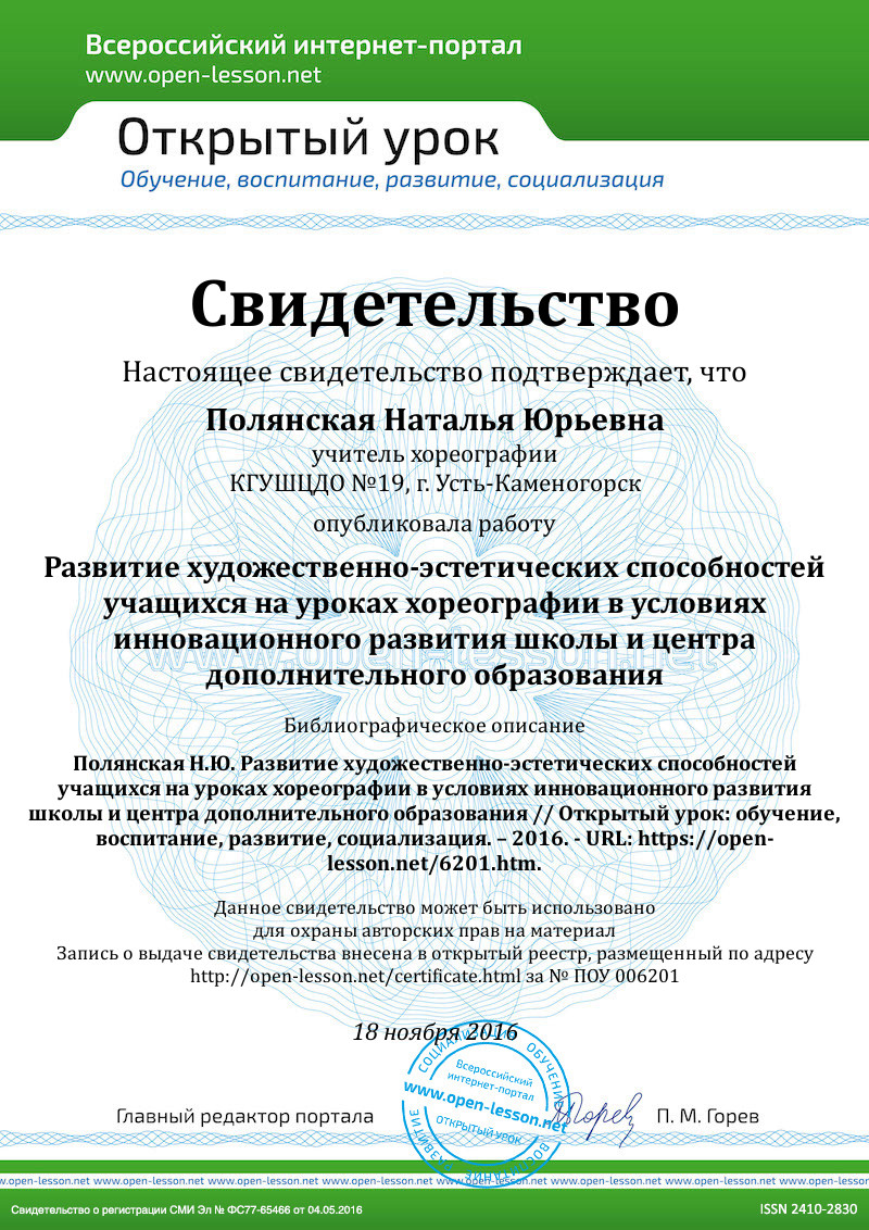 7. Чечина, Ж.В. Урок хореографии, как основная форма организации образовательного процесса [Текст] // Дополнительное образование в современном мире: сборник научной конференции – СПб.: ЦРНС, 2011.