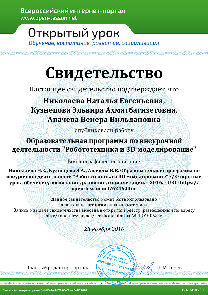 "На сегодняшний день в нашей школе разработан и прошёл первичную апробацию курс «Образовательная робототехника и 3D моделирование» на основе программы Компас–14 во внеурочной деятельности с учащимися 5-7 классов. На образовательном этапе проводятся эксперименты с электроникой, программирование на контроллере Arduino и Lego, используются технологии 3D-моделирования в межпредметных областях учебного процесса и робототехнике по внеклассной работе в школе, проводятся мастер-классы одаренных учащихся, освоивших курс, с начинающими заниматься робототехникой учениками. На заключительном этапе изучаем возможность встраивания робототехники и 3D моделирования в предмет «Информатика и ИКТ», определяем разделы курса информатики и ИКТ, на которых возможно их применение. Выявляются и дорабатываются технические несовершенства. В перспективе планируется: - совершенствование программы курса; - вовлечение большего количества детей; - расширение материальной базы, получение оборудования; - привлечение научных работников, специалистов-инженеров, сотрудников заводов; - участие в бизнес-проектах, конкурсах по техническому моделированию, инженерных фестивалях, выставках технического творчества."