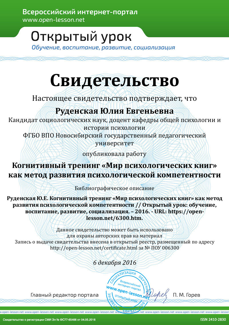 - Руденская Ю.Е. Рефлексивный видеотренинг как когнитивно-поведенческий метод профессионального обучения//Профессиональное образование и занятость молодежи- XXI век: материалы Международной научно-практической конференции (Кемерово, 27-28 марта 2013 г.) в 2 ч. Ч 2/Департамент образования и науки Кемеровской области, ГОУ «КРИРПО», ФГНУ «Институт теории и истории педагогики» РАО, ФГБОУ ВПО «Кемеровский государственный университет». – Кемерово, КРИРПО, 2013. – С. 248 – 250.
