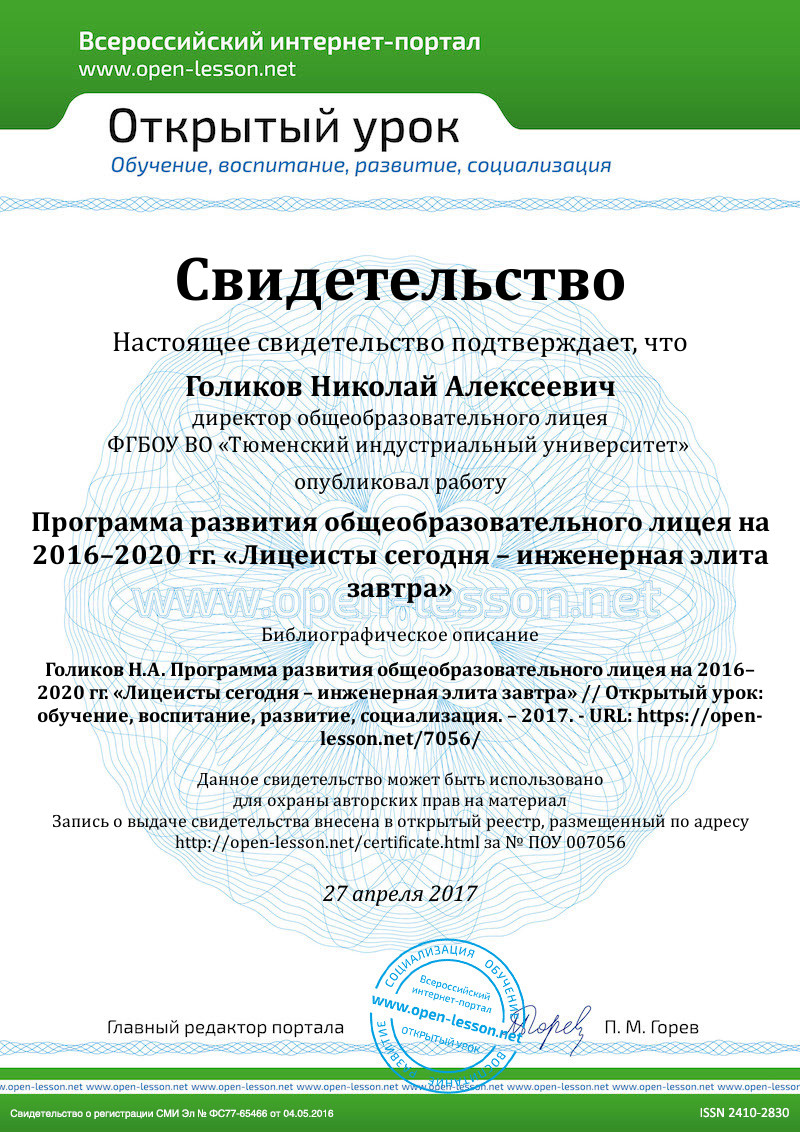 Голиков Н.А., директор общеобразовательного лицея, к.п.н., профессор