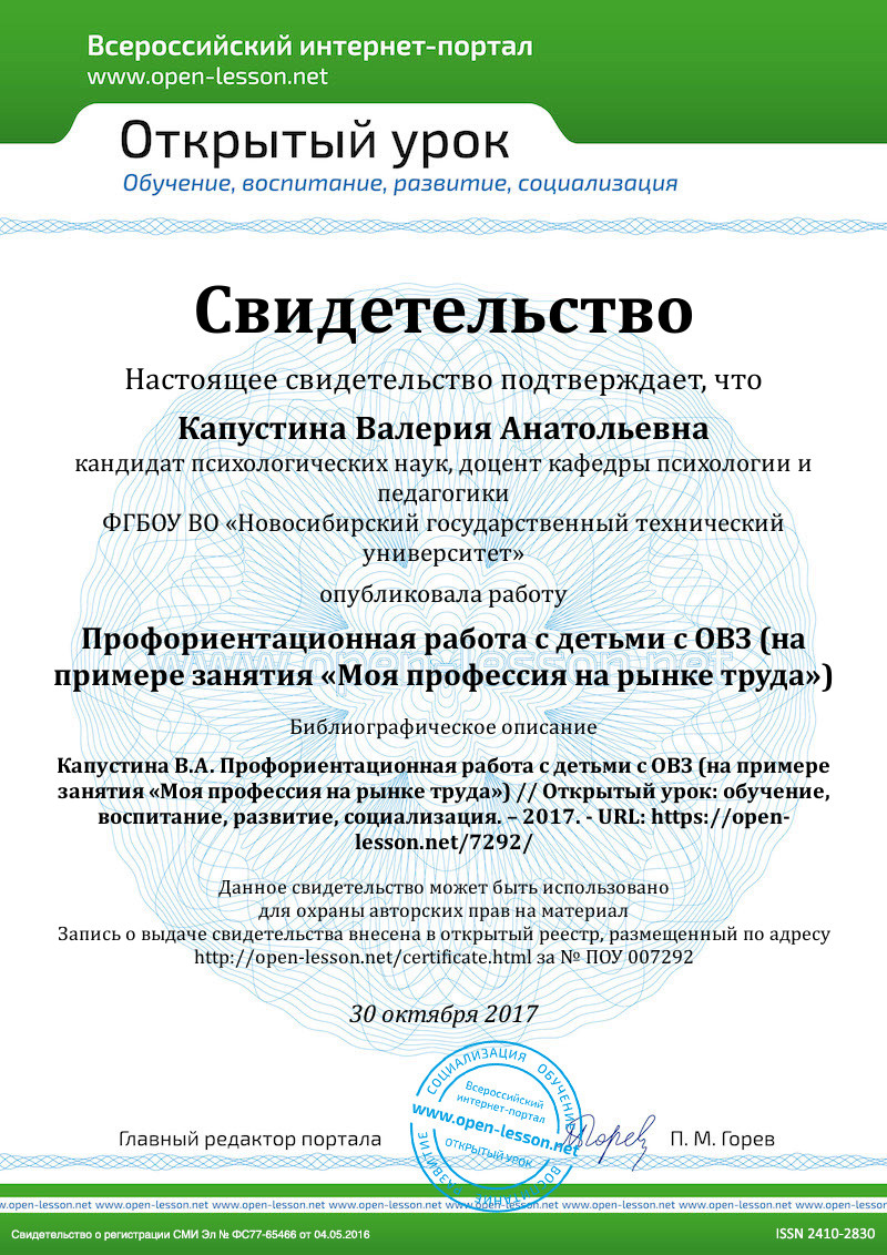Важным моментом профориентационной деятельности с детьми, имеющими ограничения по здоровью, является и перечень подходящих для них профессий в рамках получения среднего профессионального или высшего образования. В частности, примером такого банка профессий может быть перечень подходящих специальностей для людей с ОВЗ, созданный на базе проекта «Я могу!» сотрудниками ГБУ ДО ЦППМСП Невского района Санкт-Петербурга [5]. Минусом данного перечня является отсутствие информации об организациях, в которых указанное образование можно получить [6], но для составления общего представления о своем потенциале у ребенка с ОВЗ он вполне подходит. Также ознакомиться с подобной информацией можно и на сайтах образовательных организаций как среднего профессионального образования, так и высшего образования. В частности, на сайте ГАУ НСО «Комплексного центра социальной адаптации инвалидов» г. Новосибирска представлена информация о бесплатном обучении, длящемся 5–10 месяцев, по таким профессиям, как рабочий зеленого хозяйства, изготовитель художественных изделий из лозы, швея, вышивальщица (ручная и машинная вышивка), пользователь персонального компьютера, обувщик по ремонту обуви, социальный работник [7]. Институт социальной реабилитации ФГБОУ ВО «Новосибирский государственный технический университет» предлагает обучение по 15 направлениям, в числе которых адаптивная физическая культура, декоративно-прикладное искусство и народные промыслы, издательское дело, информатика и вычислительная техника, конструирование, моделирование и технология швейных изделий, конфликтология, социальная работа, программирование в компьютерных системах, педагогика дополнительного образования, экономика и бухгалтерский учет и др. [8]