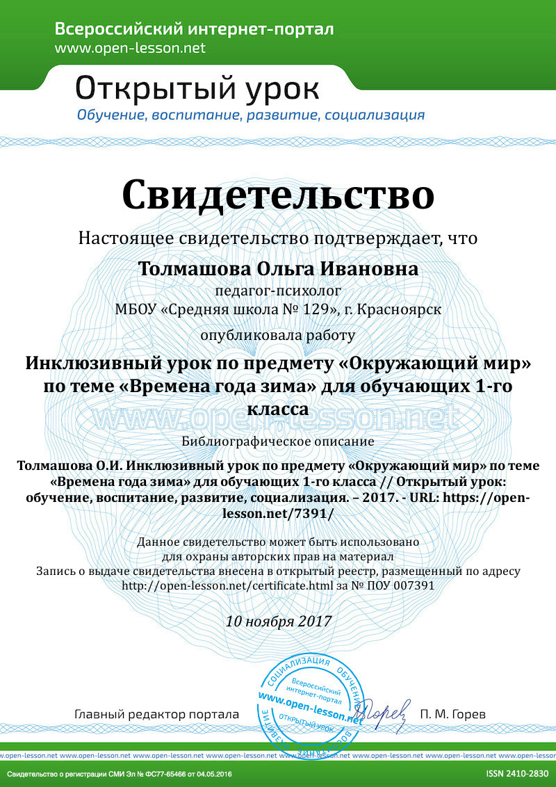 Рассмотрим технологическую карту занятия для обучающихся первого класса, направленного на формирование понятия времена года «Зима» и выделять общие и отличительные особенности сезонных изменений.
