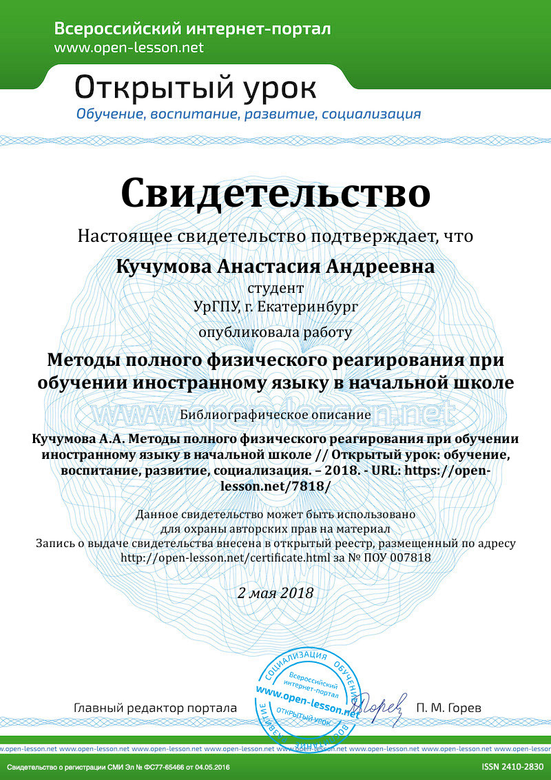 Как показывает статистика, в последнее десятилетие обучение детей иностранному языку начинается гораздо раньше, чем прежде – обучение школьников начинается уже в начальных классах. Ввиду своих психологических особенностей младшие школьники имеют преимущества при изучении иностранного языка. «Дитя мыслит формами, красками, звуками, ощущениями вообще», - напоминал учителям К.Д. Ушинский, призывая опираться на первых порах школьной работы на эти особенности детского мышления [1]. Так, изучив популярные методы и подходы к обучению иностранному языку, мы остановились на методе TPR (total physical response) или методе полного физического реагирования, как на наиболее действенном при обучении младших школьников.