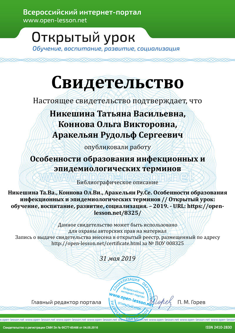 - Коннова О.В., Аракельян Р.С., Куксина Ю.М., Бекешова А.Р., Хисамеденова В.Р. Особенности образования неологизмов в современной медицинской терминологии (на примере эпидемиологических терминов) //Вестник Российского нового университета. Серия: Человек в современном мире. 2018. № 4. С. 140-144.