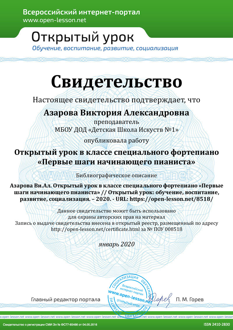 Открытый урок проведен с ученицей 1 –го класса отделения «Фортепиано» Ашмариной Полиной, 6 лет.