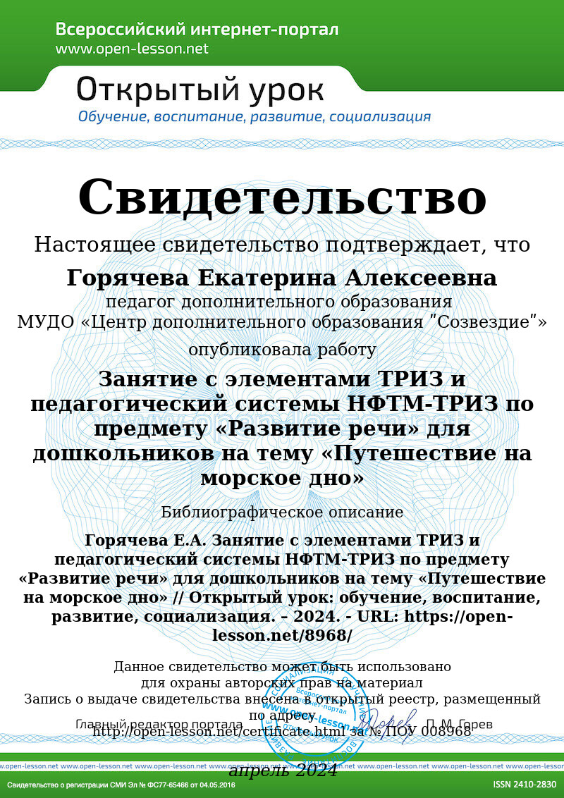 Конспект занятия с элементами ТРИЗ и педагогический системы НФТМ-ТРИЗ на тему «Путешествие на морское дно».