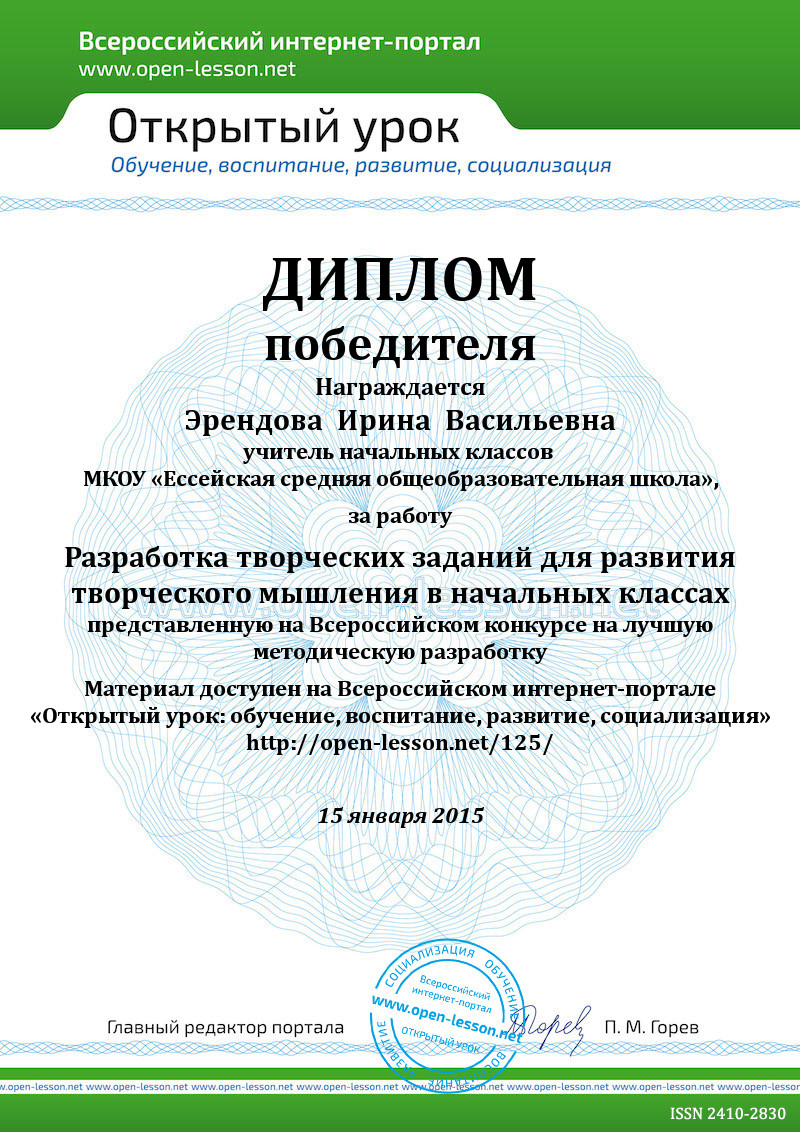 Как известно, неспособных детей нет, нужно просто помочь ребёнку развить его способности, сделать процесс увлекательным и интересным. Главное начать как можно раньше и результат можно будет увидеть уже в конце 1 класса. Постоянно возникает вопрос «Нужна ли олимпиада по математике в начальной школе?» Необходима. Но как в условиях традиционной программы подготовить детей? Нельзя ограничивать детей школьной программой. Надо раскрепостить мышление ученика, использовать те богатейшие возможности, которые дала ему природа. Поэтому я считаю, что можно даже на уроке найти 5–10 минут на решение нестандартных задач, развивающих логику и смекалку, направленных на развитие творчества ребенка. Такие занятия помогают сформулировать собственную точку зрения, воспитывают в детях доверие к собственным силам и интерес к другому мнению, учат культуре общения. Очень хорошо если этому можно посвятить целый урок. Способствует развитию креативности и факультативные занятия. Немало важной ступенью в развитии креативного мышления является обучение решению задач познавательного, поискового и творческого характера.