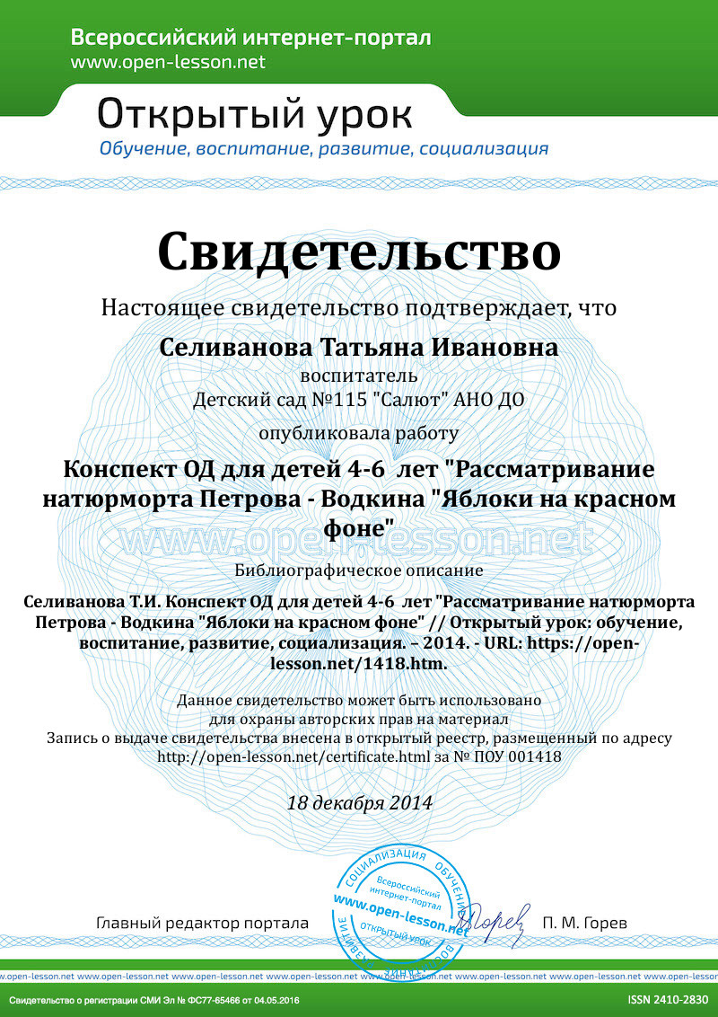 - картина К.С. Петрова-Водкина «Яблоки на красном фоне» (из учебного пособия Н.А. Курочкиной «Знакомим с натюрмортом»);