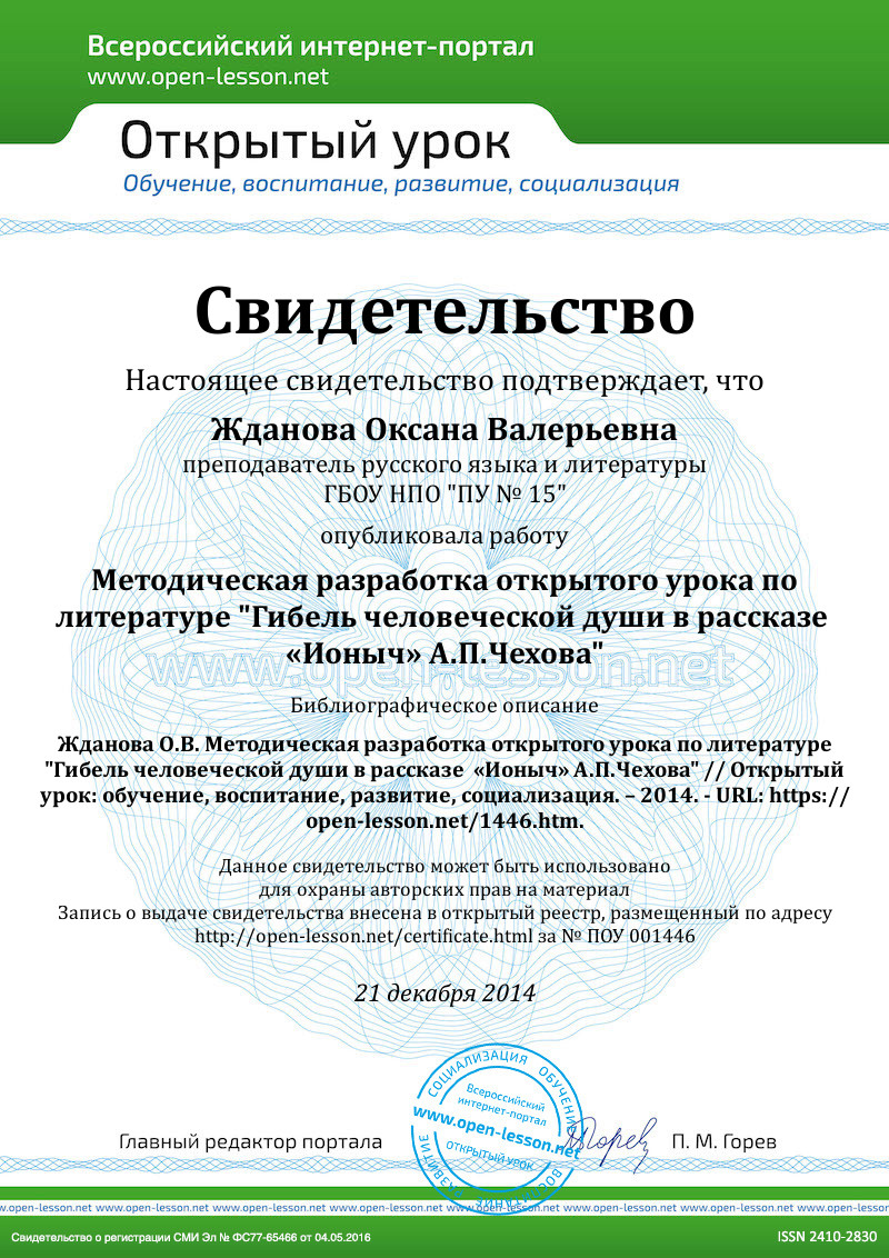 Литература: текст рассказа «Ионыч»; учебники: Е.С.Роговер «Русская литература XIX века», В.Ю.Лебедев «Русская литература XIX века», словари, «Русские писатели в Томске», по А.Бычков « Течение мелиховской жизни» и др.