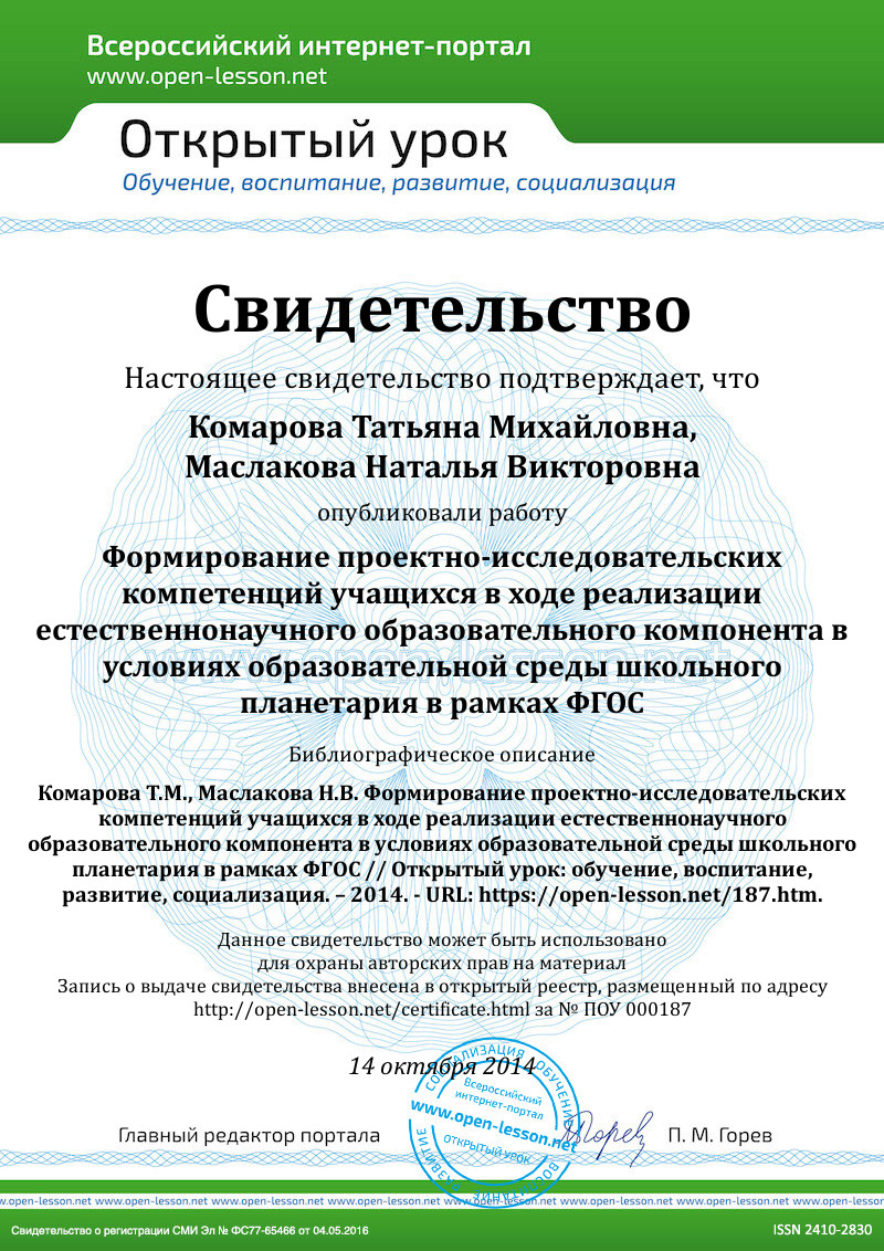 Формирование проектно – исследовательских компетенций учащихся в ходе реализации естественнонаучного образовательного компонента в условиях образовательной среды школьного планетария в рамках ФГОС представлено модульной образовательной программой МАОУ СОШ№17 муниципального образования город-курорт Геленджик с. Архипо-Осиповка. Программа направлена на создание избыточной образовательной среды ОУ в условиях детского космического Центра для раскрытия потенциала учащихся в проектно-исследовательской деятельности, посредством освоения наукоемких дисциплин естественнонаучного цикла и социального проектирования.
