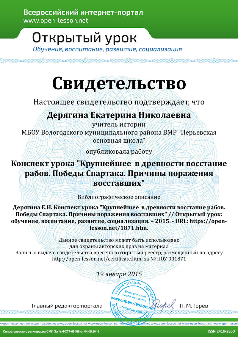Как же мы можем ответить на эти вопросы? Учащиеся высказывают свои мнения Все методы хороши! Можно и в учебнике прочитать, и я могу вам рассказать, но не интереснее ли вам самим побыть в роли учёных – историков? Ведь и у историков возникает много вопросов о прошлом наших предков, и на вопросы часто им помогают ответить самые достоверные письменные источники – документы. Я предлагаю вам тоже побыть в роли учёных. Вы согласны? Каждому из вас выдан отрывок из произведения римского историка Плутарха. Прочитайте этот документ. Учащиеся читают фрагмент документа про себя, затем вслух На какие из поставленных вопросов мы можем ответить, благодаря документу? Об участниках, количестве, причинах, вооружение и предводители восстания Кто был участником восстания? Гладиаторы Где началось восстание? В школе гладиаторов в городе Капуе. Почему началось восстание гладиаторов? Своё мнение подтвердите словами документа Несправедливость хозяина (учащиеся зачитывают строки из документа) Сколько рабов собиралось бежать из школы? 200 гладиаторов Сколько сбежало? 78 Почему не всем удалось сбежать? Зачитайте нужные строки из документа. Учащиеся зачитывают строки из документа Чем были вооружены рабы? Кухонными ножами, вертелами Кого выбрали рабы своим предводителем? Спартака Что рассказывает о Спартаке Плутарх? Зачитайте. Учащиеся зачитывают строки из документа Итак, ребята, как вы думаете, почему именно с документами предпочитают работать учёные – историки? Учащиеся высказывают своё мнение. Интересно ли вам было в роли историка? Учащиеся высказывают своё мнение. Мы знаем, что рассказывал Плутарх, римский историк о Спартаке. …(имя учащегося) приготовил нам сообщение о Спартаке. Давайте внимательно послушаем это сообщение и узнаем новое и интересное об этой легендарной личности. Учащиеся внимательно слушают сообщение своего одноклассника. Ребята, оцените сообщение Учащиеся по желанию оценивают выступление, обосновывают выбор оценки. Учитель также оценивает, обращает внимание на то, что сведения в сообщении достоверные, было сообщение подготовлено по собственной инициативе, по желанию учащегося. Итак, каким же был Спартак? Мужественный, смелый…. Что же мы с вами уже знаем о восстании? Слайд №5 Запишите в тетради эти данные. Учащиеся делают записи в тетради.