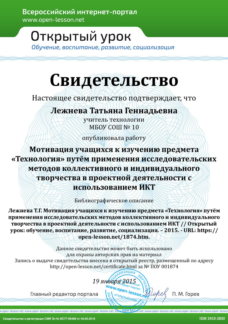 - ГНПК учителей. Выступление Лежневой Т.Г. на конференции в рамках ГМО по теме: «Мотивация учащихся к изучению предмета «Технология» путём применения исследовательских методов коллективного и индивидуального творчества в проектной деятельности с использованием ИКТ». 26.03.2013