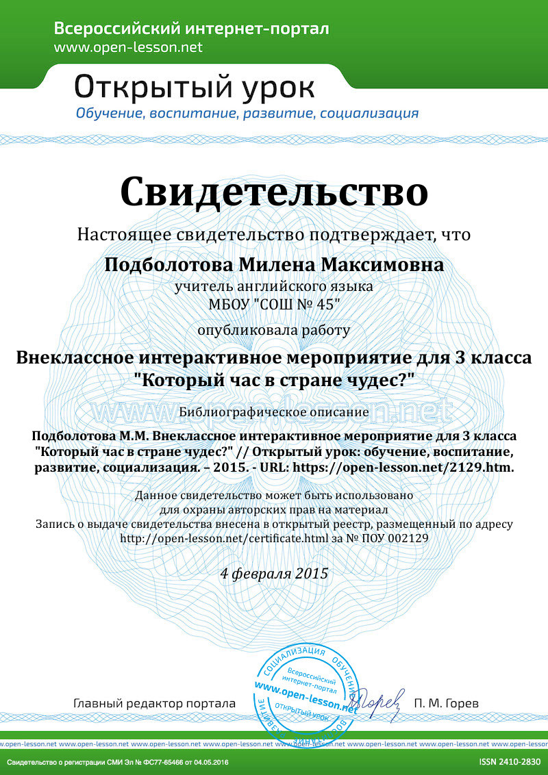 Well, I can see that you’re ready! Let’s star our game “What’s the time in Wonderland?” Играть мы будем в командах, и так как мы отправляемся в путешествие по стране Wonderland, назовем наш путь Wonder(на доске написано слово Wonder). У каждой команды своя пешка-магнит, при каждом успешно выполненном задании пешка команды двигается на шаг вперед (шаг = буква в слове Wonder, изначально все пешки стоят под буквой W).Чья пешка по окончании игры окажется ближе всех к концу слова Wonder, та команда и победила! (убедиться, всем ли понятны правила игры) Let’s start! Look at the screen. Do you know who this is? (на экране изображение белого кролика из сказки Алиса в стране чудес) Чтобы знать, с каким персонажем мы сегодня будем играть, сложите его имя из букв на экране, цифры вам подскажут, какая буква на каком месте должна быть! (задание №1, проверка выполнения – по одному представителю от каждой команды выходят к доске и показывают результат) And now, the first task from The White Rabbit! Look at the screen, guess the words hidden and find the odd one! (задание №2, ученики расшифровывают анаграммы с цифрами и находят лишнее слово tower, ответы так же проверяются у доски одним участником команды). Goodjob! Andnowпосмотрим насколько вы внимательны! Используя листы для ответов № 3, посчитав количество ударов часов, нарисуйте на циферблатах стрелки и запишите, который час. (задание №3, звучит запись ударов часов, записи делаются в паузах, проверяется у доски). Great! We continue to follow The White Rabbit! Подглядим, чем занимаются обитатели страны чудес. Ваша задача – определить, во сколько они играют в крокет? Пьют чай? Гуляют в парке? (задание №4, подсказки отображаются на экране, ответы записываются на листы ответов, ответы проверятся у доски). Молодцы! Но TheWhiteRabbit не перестает волноваться о том, чтобы нигде не опоздать и везде успеть! А для этого нужно уметь правильно определять время. Look at the screen and say, What’s the time? Не забывайте, о каком времени суток нам говорят буквы a.m. и p.m. (задание №5, на экране изображение циферблатов, необходимо верно записать ответ на вопрос Который час, ответ проверяется у доски). You are doing very well! The White Rabbit is pleased! But he has one more task for you! Вы знаете, что на нашей планете существует несколько часовых поясов и время в разных городах может отличаться. Look at the screen. It’s 3 o’clock in Moscow. Say, what’s the time in London? In New York? InRome? InTokyo? Зная, что в Лондоне на 3 часа меньше, чем в Москве, в Нью-Йорке на 8 часов меньше, в Риме на 2 часа меньше, а в Токио на 5 часов больше! (задание №6, на листах для ответов ученики должны нарисовать стрелки на пустых циферблатах, и приклеить подпись с верным временем, ответы проверяются у доски). |