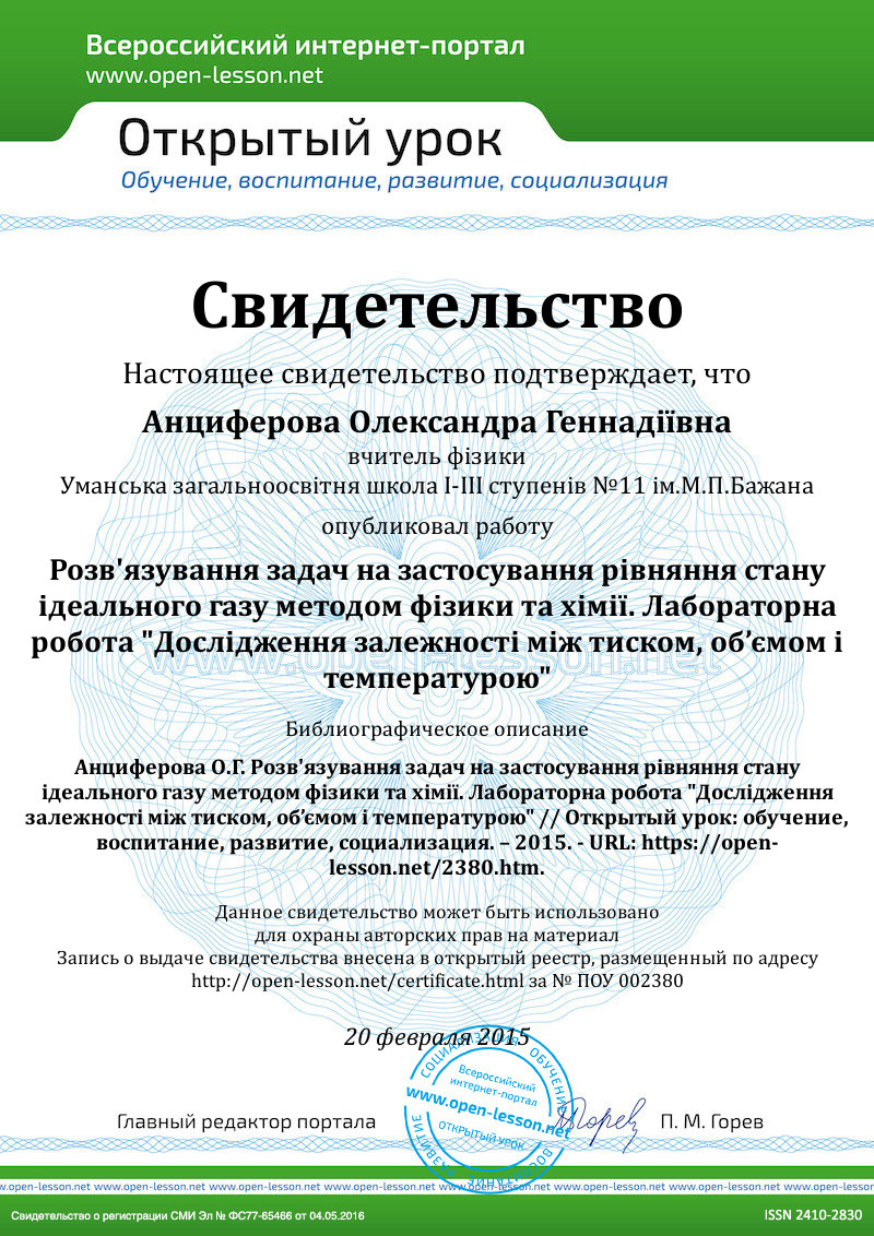 Мета: навчити учнів розв’язувати задачі на рівняння стану газу фізичним та хімічним методами; розвивати уміння учнів користуватися комп’ютерною технікою та обізнаність у проведенні експериментів за допомогою «Віртуальної фізичної лабораторії»; виховувати інтерес до вивчення наук природничо-математичного циклу, використовуючи новітні комп’ютерні технології.