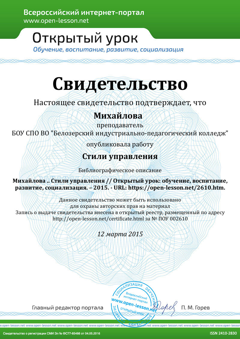 Вывод: Стиль работы должен быть динамичным, меняющимся в зависимости от ситуаций и объектов руководства (либеральный – искусство, авторитарный – армия). Поэтому умение руководить – умение владеть разными стилями, менять стили руководства, вырабатывать индивидуальный стиль. Эффективным руководителем считается тот менеджер, который способен определить и принять тип руководства, наиболее полно отвечающий политике компании, ее общим задачам, традиционному стилю и ценностям, масштабу, структуре и методам работы.