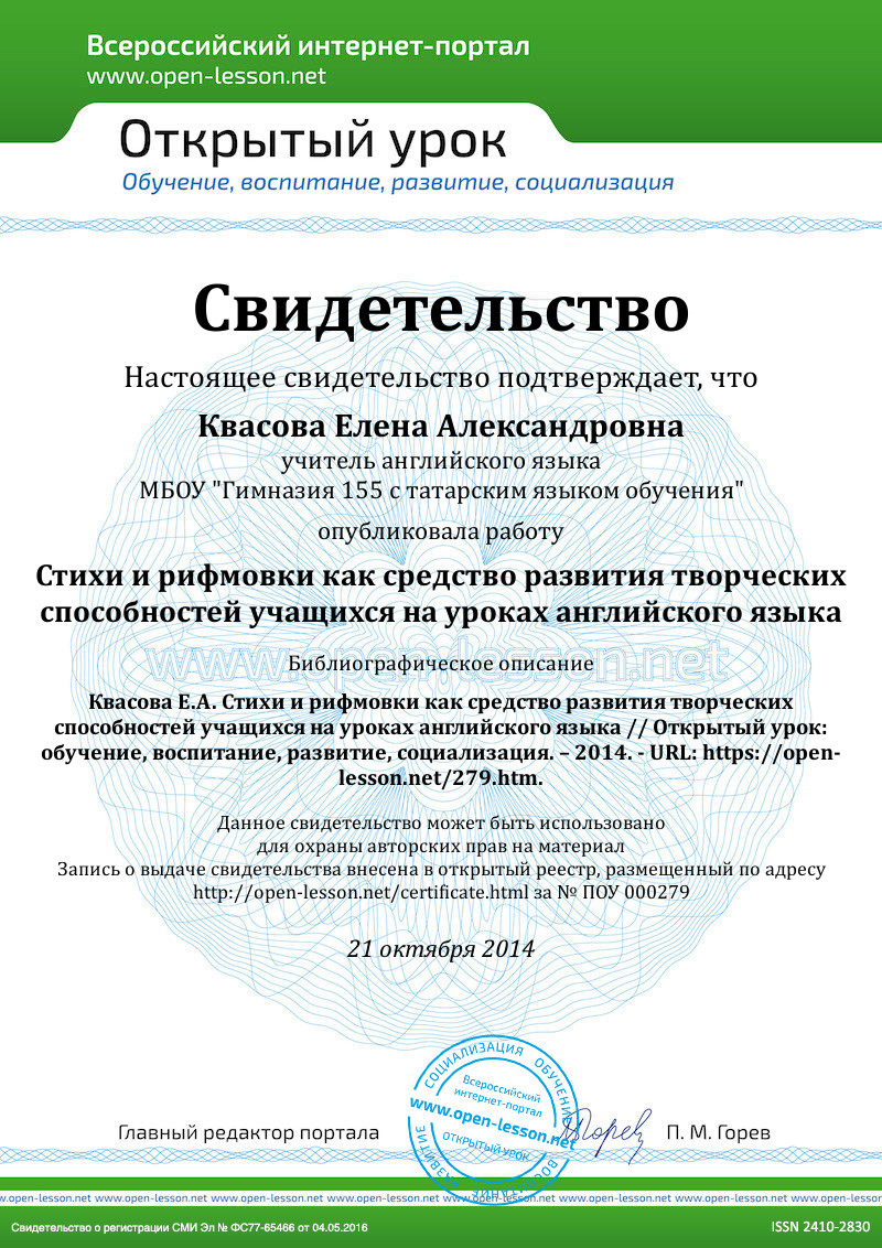 2. Дьяченко Н.П. Стихи, рифмовки и песни как средство повышения эффективности урока английского языка: Н.П. Дьяченко // Педагогический вестник. – 2004, №3. – С. 30-33.