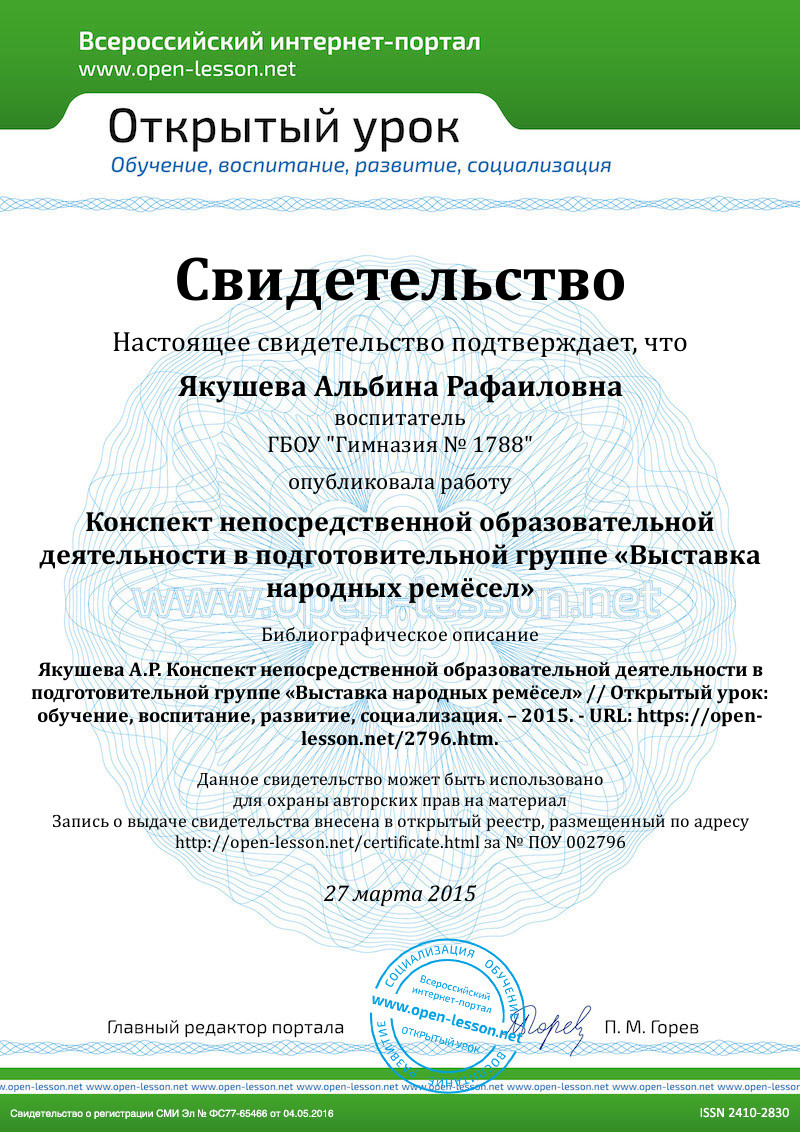 Воспитатель: Правильно, молодцы. Ребята, нам по почте пришло письмо. В нём сообщают, что в Москве организуется «Выставка народных ремёсел» и организаторы выставки приглашают нас принять участие. Для этого необходимо изготовить различные сувениры. Вы согласны принять участие в выставке?