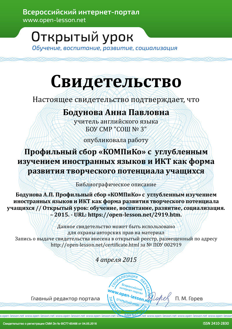 Добрый день, уважаемые коллеги! Разрешите представить тему моего доклада: «Профильный сбор «КОМПиКо»с углубленным изучением иностранных языков и ИКТ как форма развития творческого потенциала учащихся»