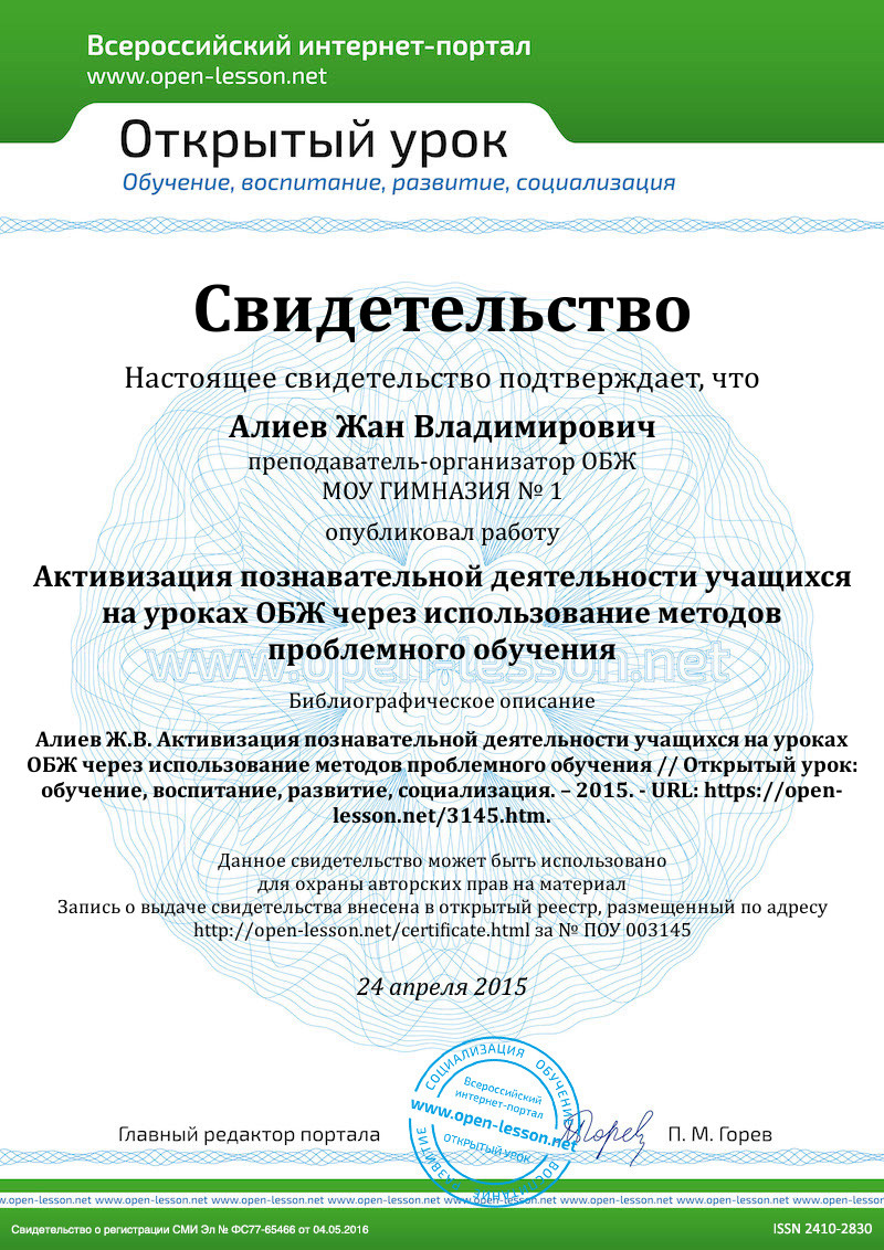 Имея в своем педагогическом багаже методы проблемного обучения , преподаватель ОБЖ может способствовать формированию творческой, активной личности, достойного гражданина обновленной, демократической России.