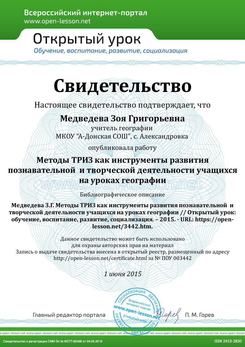 Подводя итог данной работы, хочу заметить, что уроки географии с ТРИЗ – «это уроки мудрости, счастья и творчества». В ходе таких уроков у учащихся появляется мотивация и желание развивать свое мышление. Наверно, никто не будет возражать против утверждения, что, если человек не может использовать законы и правила на практике, то он не знает этих законов и правил. Он может их процитировать, но не более. Поэтому для освоения правил ТРИЗ надо самостоятельно решать много задач. Важно показать ребенку полезность и нужность лично для него знания приемов мышления. Для этого приходится отслеживать процесс мышления ребенка, долго и терпеливо снимать старую доминанту (господствующий очаг возбуждения в центральной нервной системе, который создает скрытую готовность к одному виду деятельности и позволяет другие виды деятельности) и выращивать новую доминанту. Этот процесс напоминает уход за саженцем.