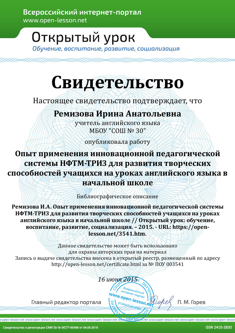 50% - предпочитают работать в группе; 2% - слушать информацию. 100%- отметили, что уроки английского языка стали увлекательнее. Опыт применения технологии НФТМш-ТРИЗ обобщался на пед. совете «Применение современных образовательных технологий» в МБОУ «СОШ 30», школьном методическом объединении учителей английского языка, I Всероссийской педагогической Конференции «Опыт успешного освоения ФГОС: проблемы, решения, результаты», которая проводилась на Всероссийском Общеобразовательном Портале «Продленка.орг» www.prodlenka.org с 01 апреля 2015 года по 31 мая 2015 года, опубликован в специальном приложении «Методика развития творческого мышления и творческих способностей учащихся в условиях реализации ФГОС» к научно-методическому журналу «Концепт» 29 мая 2015 года, размещен на сайте www.e-koncept.ru, см рис. № 4.