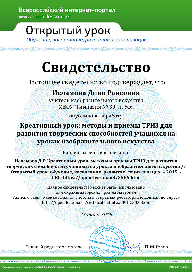 Резюме. Формирование и развитие способности к творчеству (креативности) возможно только в условиях развивающей среды, благоприятной психологической атмосферы, а также взаимодействие педагога и ученика. В процессе данного урока можно увидеть, как возрастает степень мотивации в решении тех или иных задач, почувствовать, как повышается коэффициент эмоциональности и вовлеченности в процесс обучения, наблюдать, как возрастает познавательная активность и, наконец, происходит творческая самореализация учащихся.
