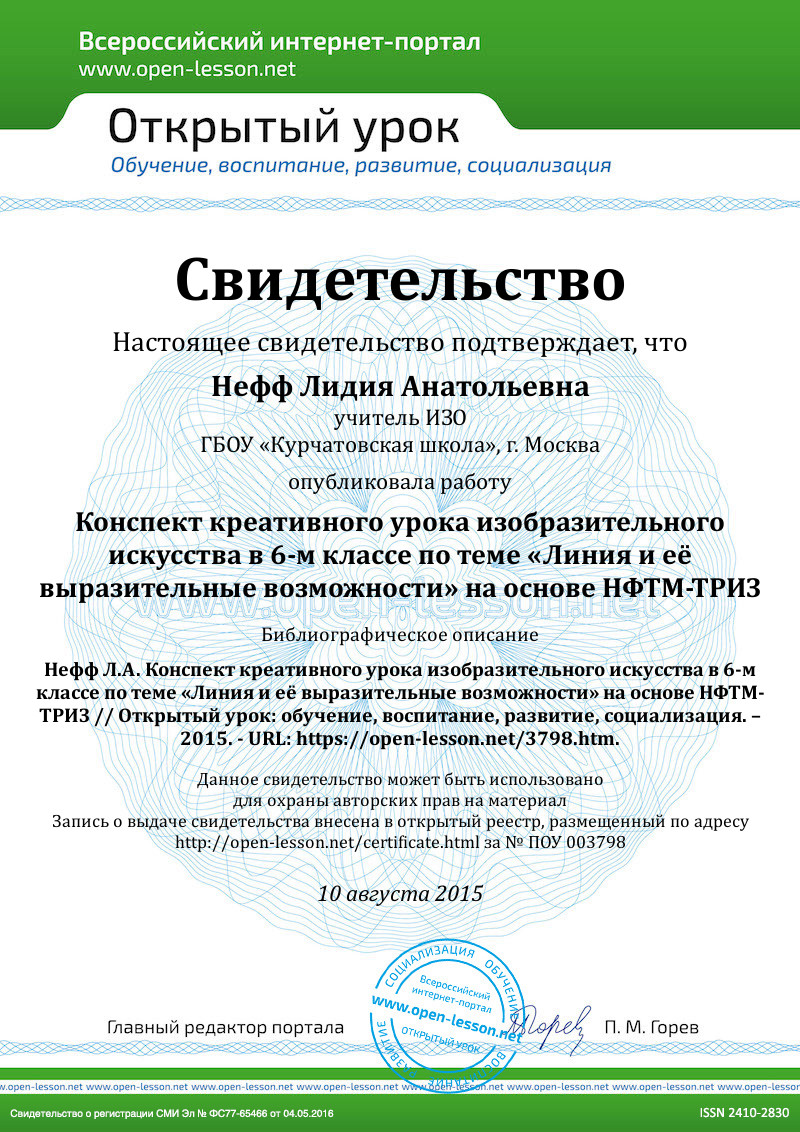 При разработке креативного урока Изобразительного искусства в 6-м классе «Линия и её выразительные возможности» автор интегрировал изученные приёмы и методики НФТМ–ТРИЗ в талантливый, проверенный временем, учебный курс под редакцией народного художника России Б. М. Неменского [3].
