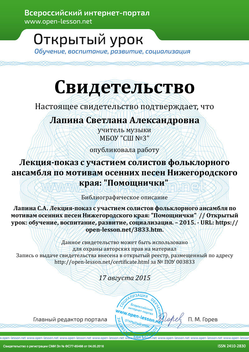 Предлагаю вниманию коллег сценарийлекции-показа с участием солистов фольклорного ансамбля по мотивам осенних песен Нижегородского края для детей 7-11 лет. Ноты песен в сценарии в рукописном варианте в разное время были представлены слушателям творческой лаборатории руководителей фольклорных ансамблей. Современные нотированные записи песен и аудио выполнены автором в нотном редакторе. Прослушать аудио можно нажав на кнопку рядом с нотной записью песни, предварительно скачав документ.
