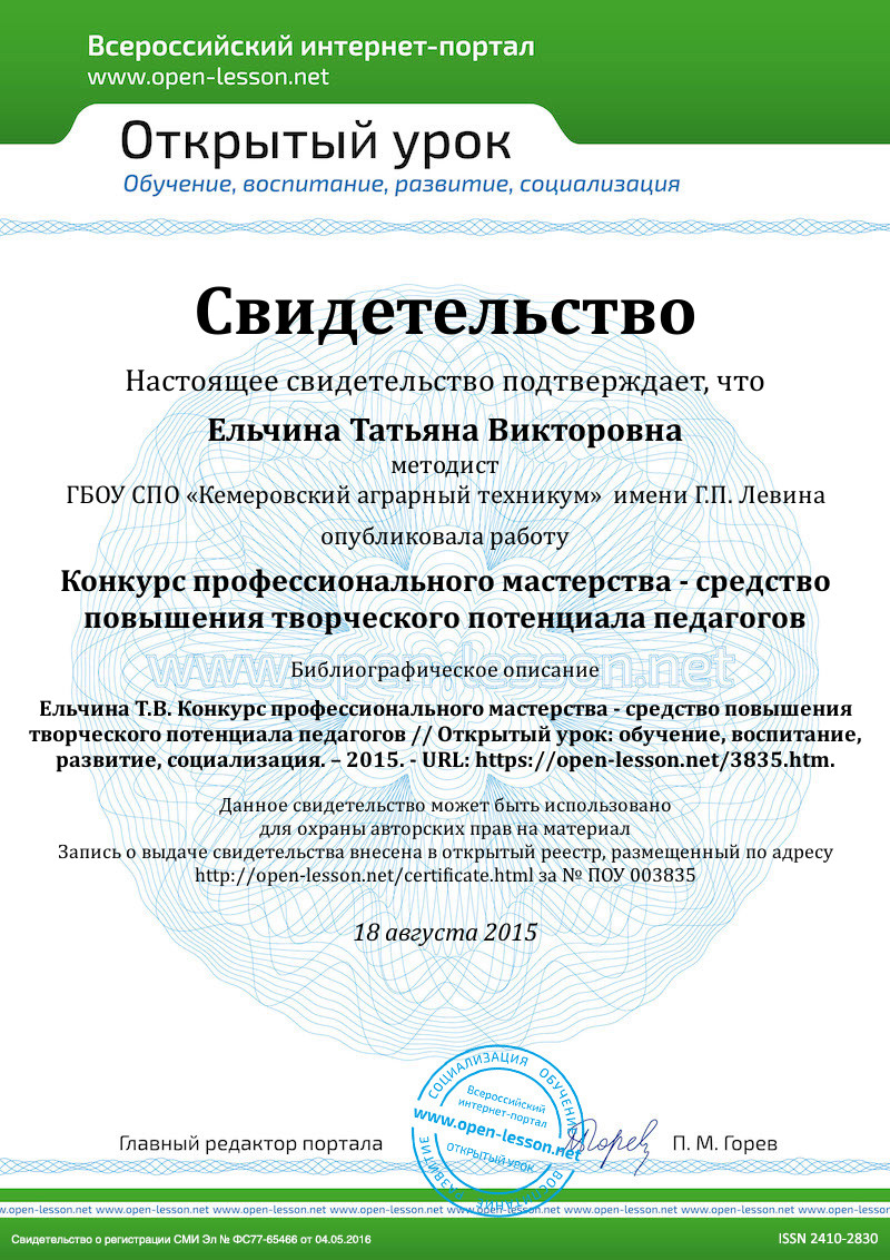 Считаю, что среди форм, получивших признание в педагогическом сообществе, существенная роль принадлежит конкурсам профессионального мастерства. Участие в подобных конкурсах дает возможность представить свой профессиональный опыт педагогической общественности, представить его в виде осознанной методической системы; помогает по-новому взглянуть на свою профессиональную деятельность; даёт возможность новых интересных знакомств, обмена педагогическими находками, стимул к следующему шагу на пути к вершинам мастерства.