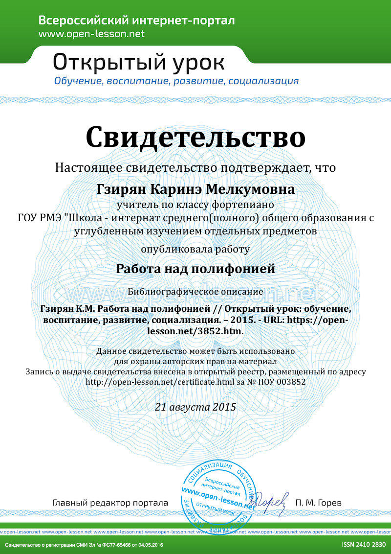 Объясняю ученику, что гамму надо сыграть ясным певучим звуком, слежу, чтобы повороты кисти были мягкими и гибкими. Так же слежу за качеством звука, ритмически ровным звучанием легато, за мягким и спокойным движением рук и пальцев.