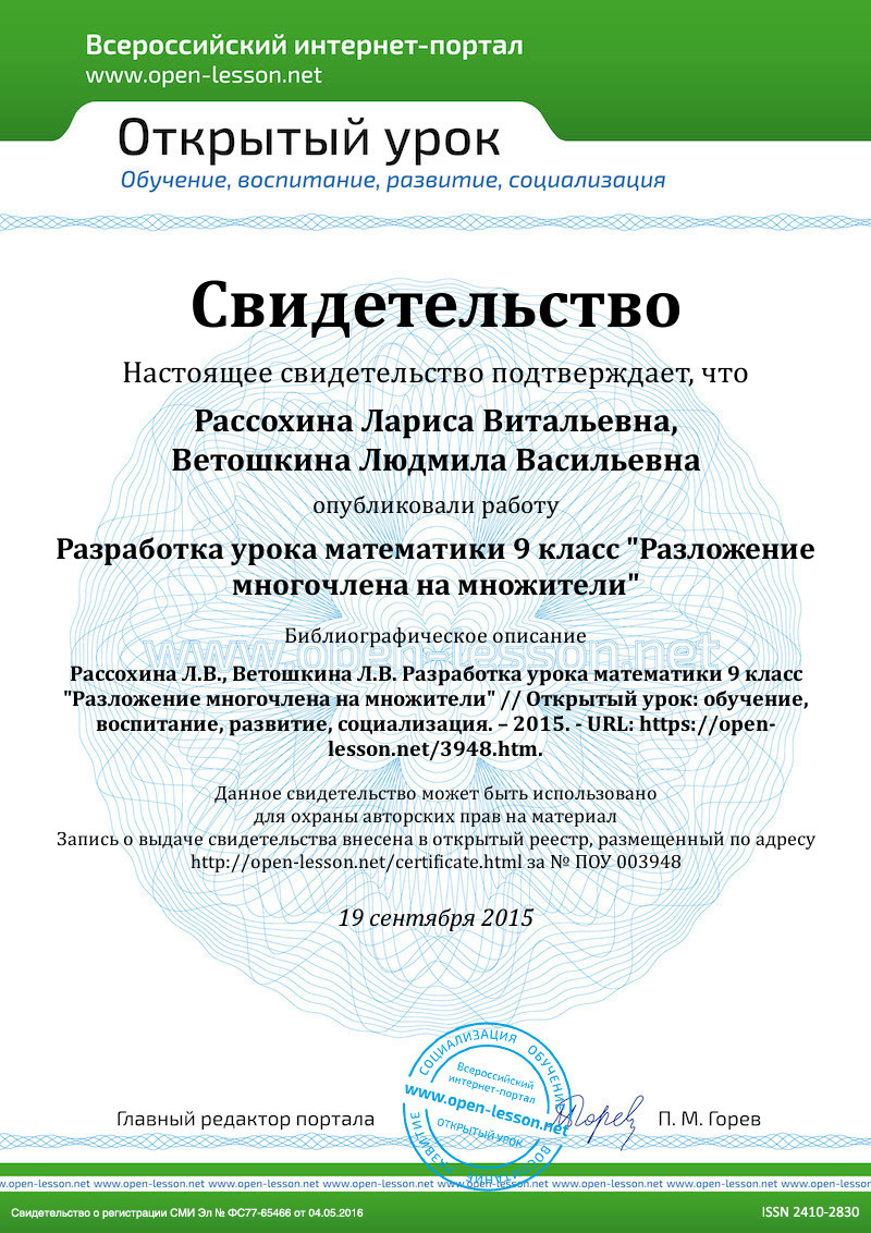 | III. Актуализация опорных знаний и умений. | Анализ содержания учебного материала. Подготовка учащихся к основному этапу урока. Включение мыслительного процесса | Организует повторение и проверку знаний и умений по теме «Разложение на множители» через проверку творческого домашнего задания |