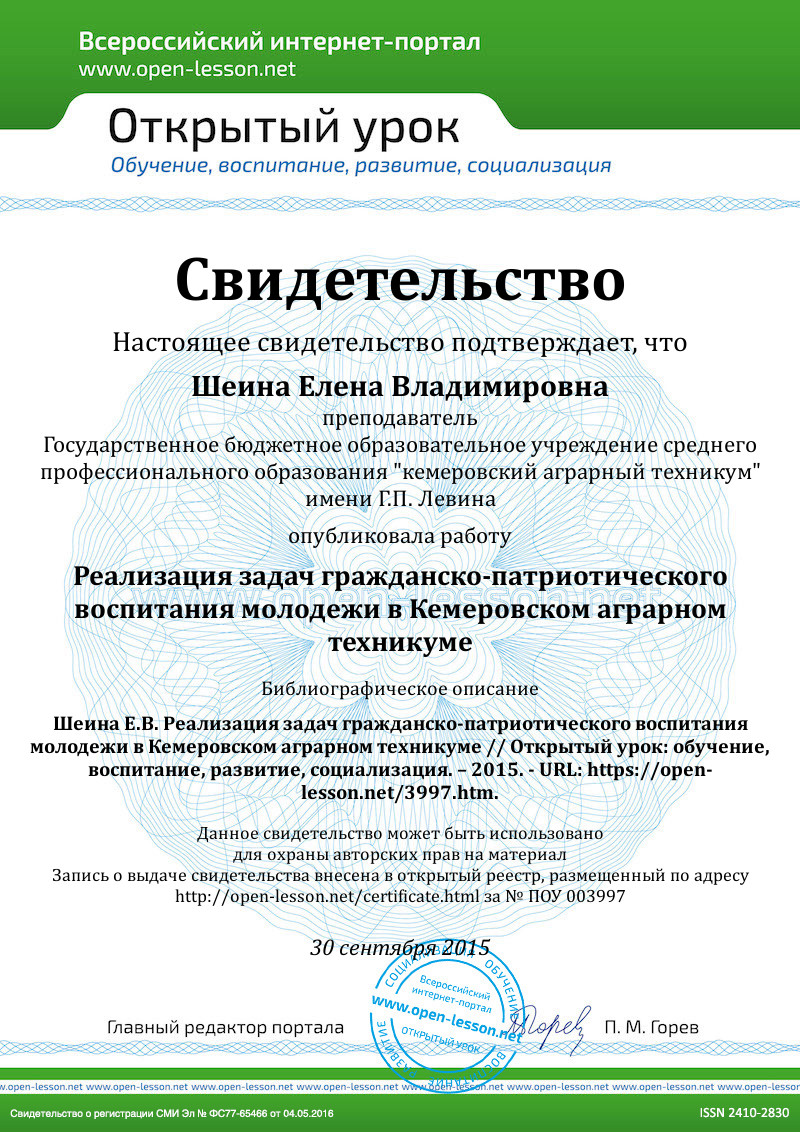 5. Молодцова, И.В. Педагогические условия становления гражданской позиции старшего подростка // Преподавание истории в школе. - Москва, 2007. -№ 1.