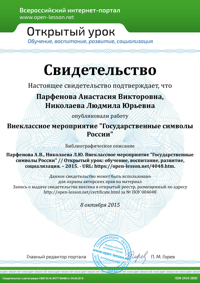 1)популяризация государственных символов Российской Федерации – Флага Российской Федерации, Герба Российской Федерации, Гимна Российской Федерации;