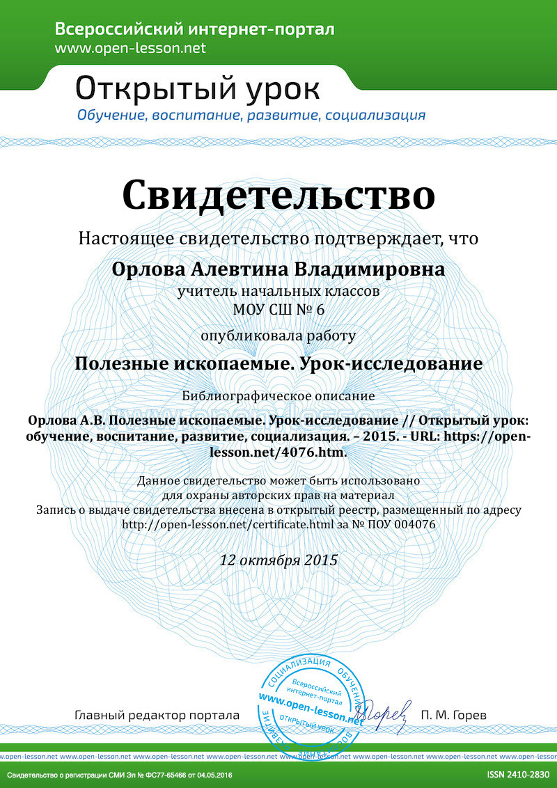 - А сейчас мы проведём практическую работу по группам (на группы можно разделиться еще в начале урока). В вашу лабораторию принесли образцы полезных ископаемых для исследования. Ваша задача: рассмотреть полезное ископаемое, изучить, перечислить его свойства. Поможет вам в этом инструкция, учебник, атлас-определитель «От земли до неба». Все исследования вам надо записать в журнал-тетрадь на стр. 26 и сделать вывод о возможном применении этого полезного ископаемого. Даю время на исследование и запись результатов. По моему сигналу работу прекращаем. Если ответ готов раньше, поднимаем сигнальную карточку.