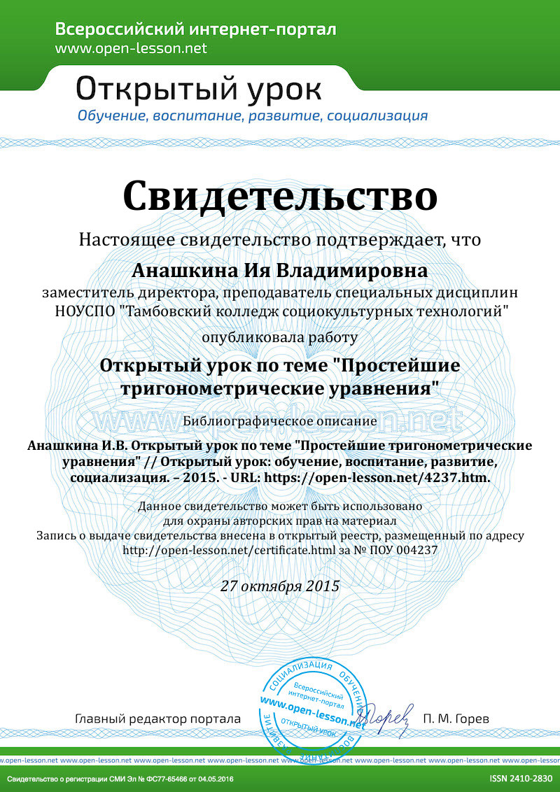 Цель: закрепить решение простейших тригонометрических уравнений.