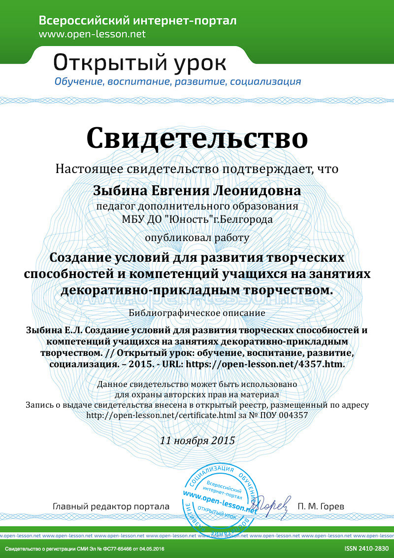 «Творчество- это не роскошь для избранных, а общая биологическаяпотребность, часто неосознанная нами….» Данная работа адресована тем, ктоинтересуется развитием творческих способностей детей, педагогам дополнительного образования, учителям изобразительной деятельности, педагогам организаторам, может использоваться для студентов социально- педагогических факультетов пед.университетов, педучилищ. В качестве примера рассмотрена деятельность конкретного детского объединения «Бисероплетение», МБУ ДО «Юность» г. Белгорода. Развитие творческого потенциала,эмоций и чувств, а также способностей детей, создание максимально комфортных условий для их общения друг с другом и с педагогом – актуальнейшие проблемы современной педагогики. Творческое начало рождает в ребенке живую фантазию, живое воображение. Важная задача дополнительного образования - развитие ввоспитанниках творческого потенциала детей. Муниципальное бюджетное учреждение дополнительного образования «Юность» - уже в названии содержит особый смысл. Согласно концепции модернизации дополнительного образования детей под «дополнительным образованием» понимается мотивированное образование за рамками основного образования, позволяющее человеку приобрести устойчивую потребность в познании и творчестве, максимально реализовать себя, самоопределиться предметно, социально, профессионально, личностно. Каждый из видов деятельности вобъединениях изначально ориентирован на творчество. Здесь не только существенно расширяются знания ребенка, но и обеспечивается возможность успеха в избранной сфере деятельности, что способствует развитию качеств личности.Декоративно- прикладное искусстводает возможность по новому взглянуть на привычные вещи, понять красоту окружающего мира и нравственно воздействовать на детей. Овладев этим видом искусства, дети приобретают веру в себя, в свое будущее.Творчестворебенка - это создание им оригинального продукта в процессе работы, над которым самостоятельно применены усвоенные знания, умения, навыки, в том числе осуществлен их перенос, комбинирование известных способов деятельности или создание нового для ребенка подхода к решению задачи. Творчество предполагает наличие у личности способностей, мотивов, знаний и умений, благодаря которым создается продукт, отличающийся новизной, оригинальностью, уникальностью.Способности - это индивидуально – психическиеособенности личности. Которые являются условиями успешного осуществления данной деятельности.В практике педагогадополнительного образования я столкнулась с тем, что дети на свои вопросы ждут готовые ответы. Из пособий по руководству на пример по бисероплетению, они берут разнообразные идеи и не все могли подумать и разработать свой эскиз. Творческая деятельность позволяет ребенкуприобрести важное по сегодняшним меркам чувство уверенности, успешности, следовательно, внутренней и социальной защищенности по отношению к постоянно меняющему миру.Пользуясь литературой по РТВ я подобрала и составила упражнения,которые позволяют развить беглость, гибкость и оригинальность мышления. Эти упражнения приводились почти на каждом занятии. Поскольку они не занимают много времени, их можно проводить во время продолжительной практической работы для снятия утомляемос