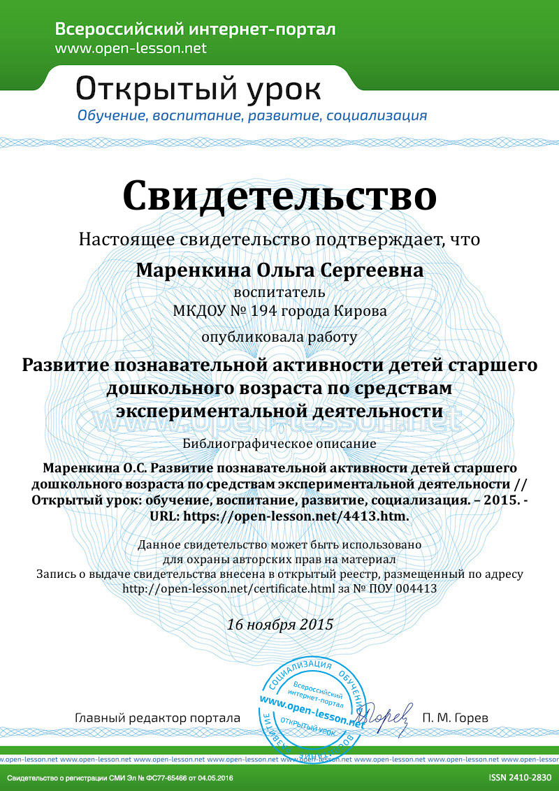 Актуальность: На пятом году жизни дети достигают больших успехов в освоении знаний о природе. Они узнают не только факты, но и достаточно сложные закономерности, лежащие в основе природных явлений. Экспериментальная работа вызывает у ребенка интерес к исследованию, развивает мыслительные операции (анализ, синтез, классификацию, обобщение), стимулирует познавательную активность и любознательность, активизирует восприятие учебного материала по ознакомлению с природными явлениями, с основами математических знаний и с этическими правилами в жизни общества. Всем известно, что важным критерием в подготовке ребенка к школе является воспитание у него внутренней потребности в знаниях. А экспериментирование как нельзя лучше формирует эту потребность через развитие познавательного интереса.