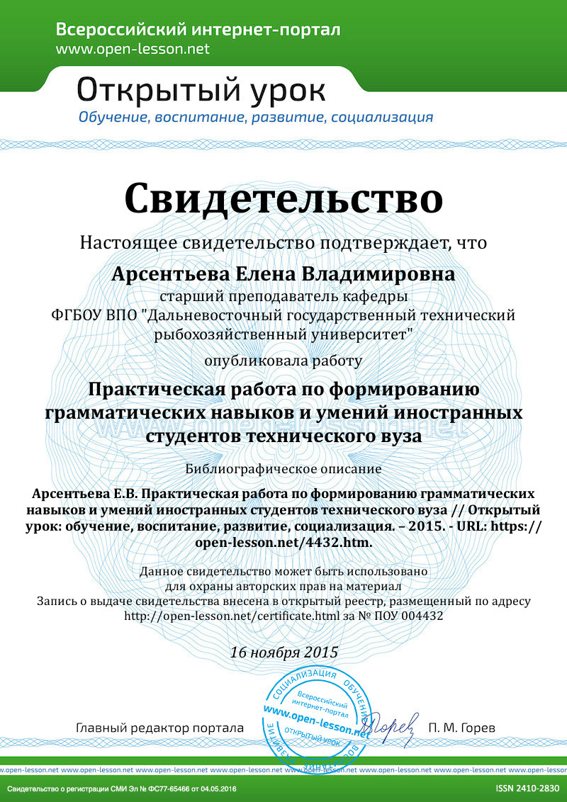3. Арсентьева Е.В., Евтушенко С.Я., Соколовская Л.А. Русский язык как иностранный. Часть 2. 1 сертификационный уровень владения русским языком. Дальрыбвтуз. Владивосток, 2015.